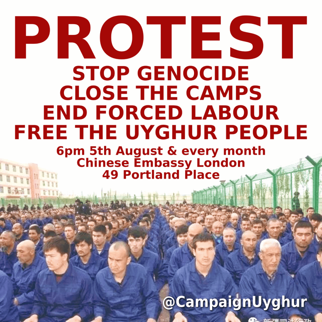 Socially-distanced protest at the Chinese embassy, for the rights of the Uyghur people in East Turkestan (Xinjiang, north-west China). This is a monthly protest on the 5th – we’re back after a pause due to COVID-19.
